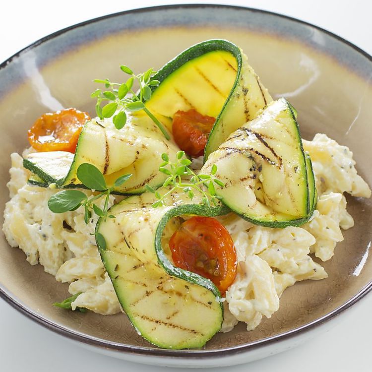 Kook de pasta af. Snijd de courgette in de lengte in dunne plakken. Gril de plakken courgette. Zweet de vers gehakte ui en knoflook licht aan in de eigen olie. Voeg de ricotta en Parrillada Aio e Lemone toe en verhit dit. Voeg de gekookte pasta toe en verwarm dit goed door. Breng op smaak met peper en zout. Garneer met de gegrilde courgette en cherrytomaatjes.