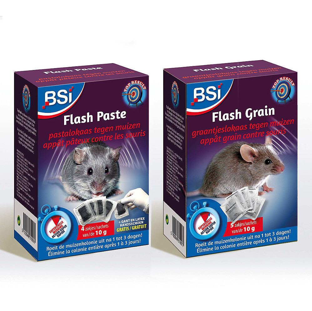 Flash producten zijn verdelgers van de nieuwe generatie, op basis van alfacloralose. Ze werken in op het centraal zenuwstelsel. Uiterst snelle werking, muizen sterven na enkele uren of maximaal 1 dag. 10 g lokaas doodt tientallen muizen. Alfachloralose valt niet onder de wettelijke beperkingen die aan de anticoagulentia opgelegd worden. Verkrijgbaar in graantjes en pasta.