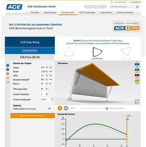 Met de online calculatietool van ACE Stoßdämpfer kunnen engineers in enkele stappen gasveren op maat berekenen voor de meest courante gasveertoepassingen. Binnen 1 minuut ontvangt de ervaren ingenieur informatie over de meest geschikte gasveer. Daarbij wordt eveneens het benodigde montagemateriaal weergegeven. Uniek is de volledig grafisch weergegeven gebruikersinterface, met de mogelijkheid om de gasveertoepassing naar keuze in 2D of 3D te visualiseren.