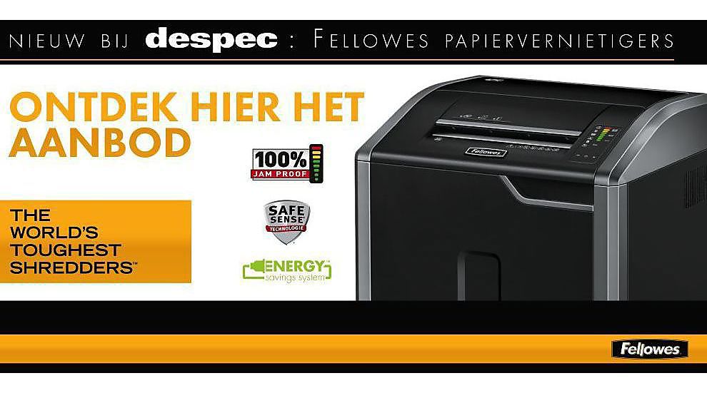 Begin februari heeft Despec Duitsland en bijgevolg ook Despec Benelux & France zijn aanbod uitgebreid met de papiervernietigers van het merk Fellowes. Despec is tevreden met deze assortimentsuitbreiding van shredders en heeft veel vertrouwen in deze nieuwe samenwerking.“Op dit moment bieden wij 36 producten en 3 types papiervernietigers van Fellowes aan: voor professioneel gebruik, voor klein of thuiskantoor en voor persoonlijk gebruik”, meldt Michel Van Amersfoort, Sales Director bij Despec Benelux & France. “Naast de drie types van papiervernietigers bieden wij ook enkele accessoires aan. Uiteraard kunnen onze klanten op de gebruikelijke ondersteuning van Despec rekenen bij de verkoop van deze papiervernietigers en accessoires”. Ook de cashbackacties zoals hieronder en eventuele andere promoties zijn uiteraard van toepassing wanneer u de Fellowes producten via Despec koopt.