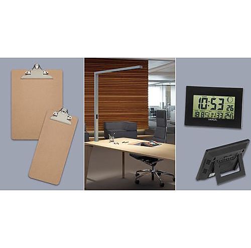MAUL levert een uitgebreid assortiment van >100 type klemborden en klemmappen. Keuze uit de formaten A3, A4 of A5 en speciale formaten zoals extra small. MAUL levert uitvoeringen in bv. hout, aluminium, hard kunststof, karton met folie overtrokken, kurk of andere materialen. Vooral de nieuwe klemborden MAULbill en MAULclassic overtuigen dankzij de mooie combinatie van natuurlijk hout met een nostalgisch papierklem. Ook onderscheiden diverse klemborden zich door de wijze van presenteren, namelijk stijlvol en duidelijk. In 2019 introduceren wij 3 nieuwe LED-vloerlampen. MAULjuvis en MAULjaval verlichten werkplek en omgeving en zijn traploos dimbaar. MAULjuvis heeft ook een bewegings- en daglichtsensor. De ster onder deze nieuwe vloerlampen heet MAULsirius: de aluminium designlamp biedt modern lichtbeheer met features zoals bewegings- en daglichtsensor en instelbare kleurtemperatuur van warmwit tot daglichtwit. De drie lampen zijn leverbaar met een stalen tafelklem met een klemwijdte van 9 cm.. Speciaal geschikt voor moderne kantoorruimtes is de MAULflow met grote klokcijfers. Ze is handig neer te zetten of op te hangen met 2 ophangogen. Daarnaast heeft MAUL een assortiment wandklokken met doorsnee mogelijkheden van 25 tot met 40cm..