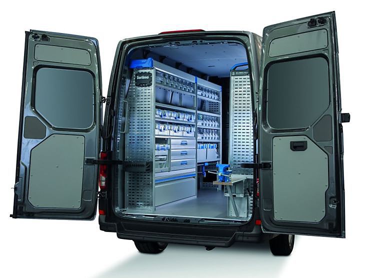 • aan de bestuurderszijde: een Sortimo HD inrichting met een belastbaarheid tot 120 kg per schap en dus bestand tegen de ruwe omstandigheden op de meest diverse bouwwerven;