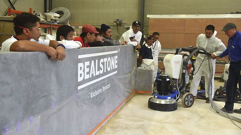Zes Japanners zijn overgevlogen naar een werf in Dilbeek om een artisanale vloer te leren leggen. De Japanners ontdekten tijdens hun week stage alle toepassingen creatieve mogelijkheden van Bealstone, een minerale bekleding ontwikkeld door het Belgische familiebedrijf Beal, en hoe je stenen, metaalschilfers of zelfs koffiebonen in het materiaal kan verwerken. Tony Bellemans, Sales Manager Europe bij Beal: “Het aanbrengen van onze bekledingen is vakwerk en vergt uiteraard de nodige kennis. Hoewel de Japanners doorwinterde coaters zijn, komen ze naar België om hun expertise te perfectioneren en nieuwe technieken, zoals Bealstone, te leren kennen. Deze minerale coating met terrazzolook kent een indrukwekkende comeback en kan heel wat troeven uitspelen, zowel wat duurzaamheid betreft als toepassingen en plaatsing.” Bealstone kan je in een dunne laag vanaf een paar mm aanbrengen op tal van ondergronden (beton, chape, tegels, MDF, multiplex…). Goed voor eindeloos toepassen binnen en buiten, horizontaal of verticaal – denk aan muren en vloeren, maar ook trappen, meubels of decoratie.