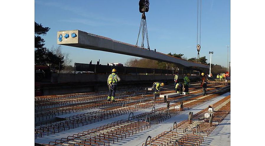 In januari 2017 monteerde Spanbeton België NV elf slanke elementen voor een brug in de E313 over het spoor Lier-Herentals te Grobbendonk. De brug bestaat uit een statisch onbepaalde constructie over twee velden met een kruisingshoek van 35 graden. De balken zijn 55 meter lang en ongeveer 8 meter hoog. Ze wegen om en bij de 120 ton. Het bijzondere aan deze elementen is vooral het ongebruikelijk overstek van 12 meter tijdens transport. Om de elementen op de bouwplaats te krijgen was het nodig dat ze met een overstek werden getransporteerd. Ze zijn per ponton naar de containerterminal van Grobbendonk gevaren, waar ze met twee mobiele kranen overgeladen werden op opleggers om de laatste kilometers per as naar de bouwplaats te brengen. De montage vond plaats tijdens een volledige afzetting van de E313 en een 24-uurs buitendienststelling van het spoor. Door een goede voorbereiding en een integrale aanpak tussen alle betrokken partijen (Spanbeton productie, intern logistiek, montage, transporteurs, ponton, kranen en aannemer Stadsbader-Deckx A.O. NV) is alles voorspoedig verlopen. De snelweg was 9 uur eerder dan gepland terug open.