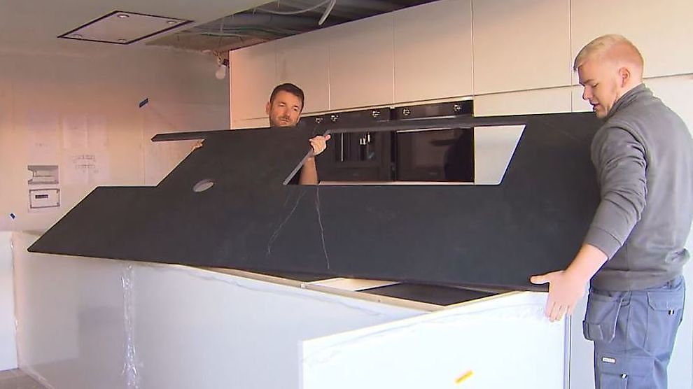 Plaatsing van de keuken - Ep. 65 - Alle voorbereidingen voor de keuken werden getroffen en de verschillende onderdelen zijn geproduceerd, dus kan overgegaan worden tot de plaatsing. Ze beginnen met het opzetten van de sokkel, waarop dan de kolomkasten gemonteerd worden. In die kasten komen ook een aantal inbouwtoestellen.